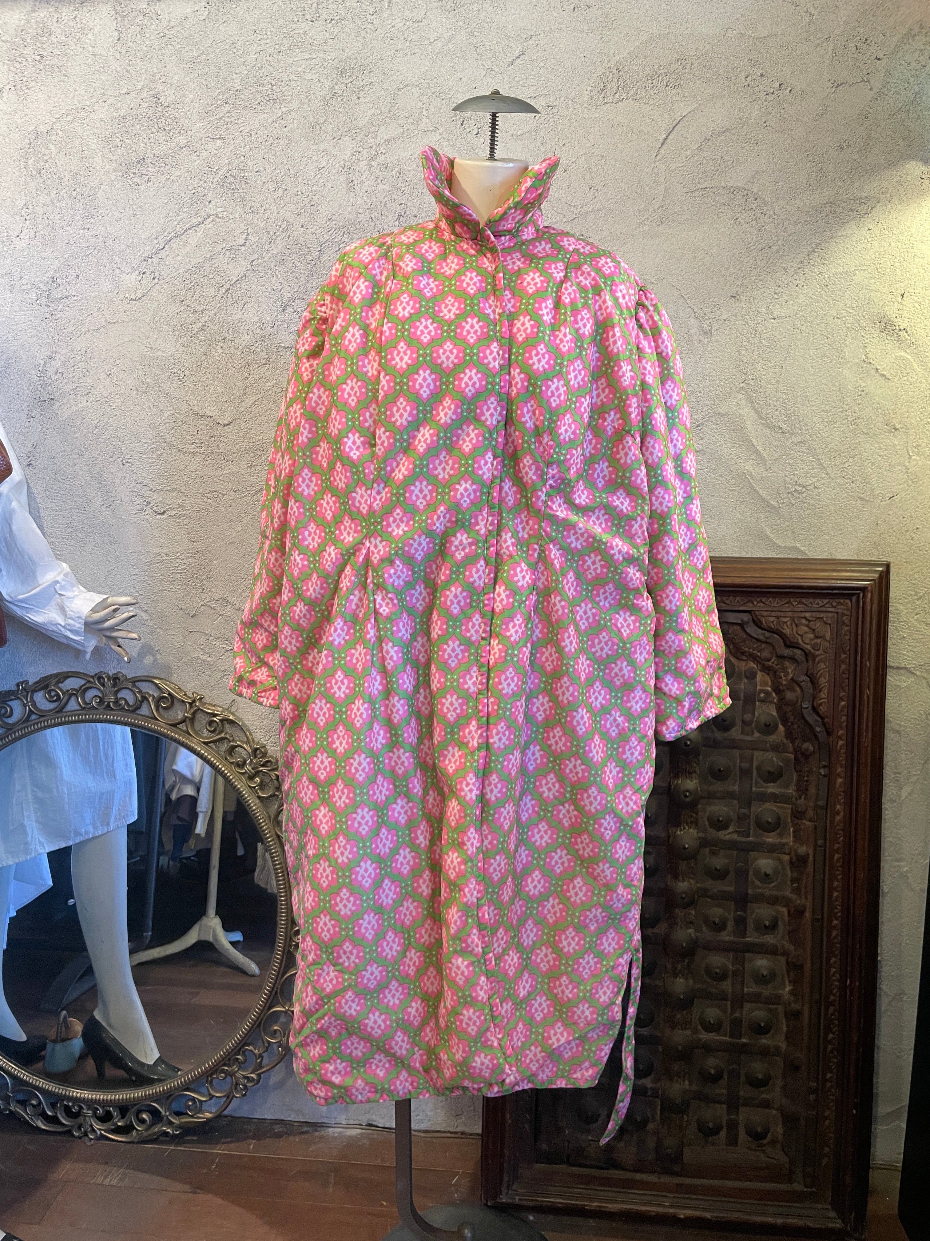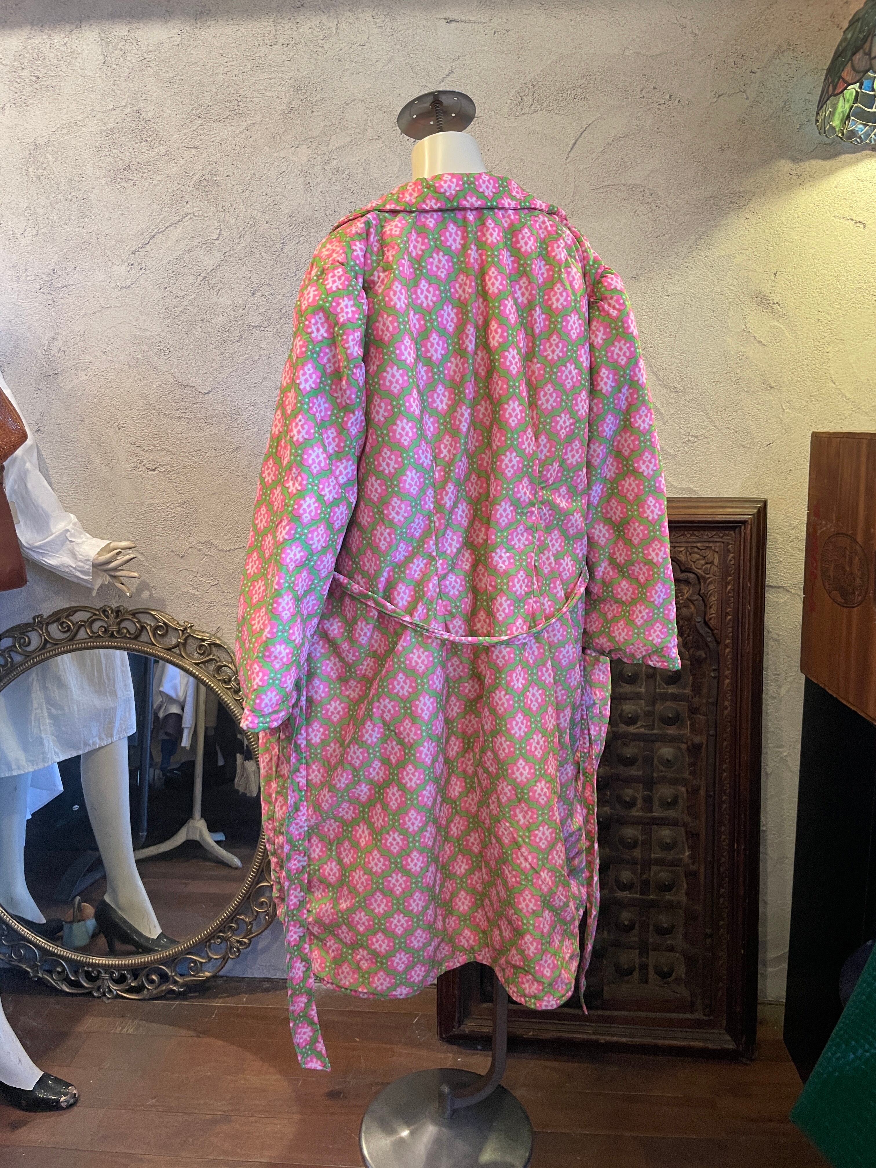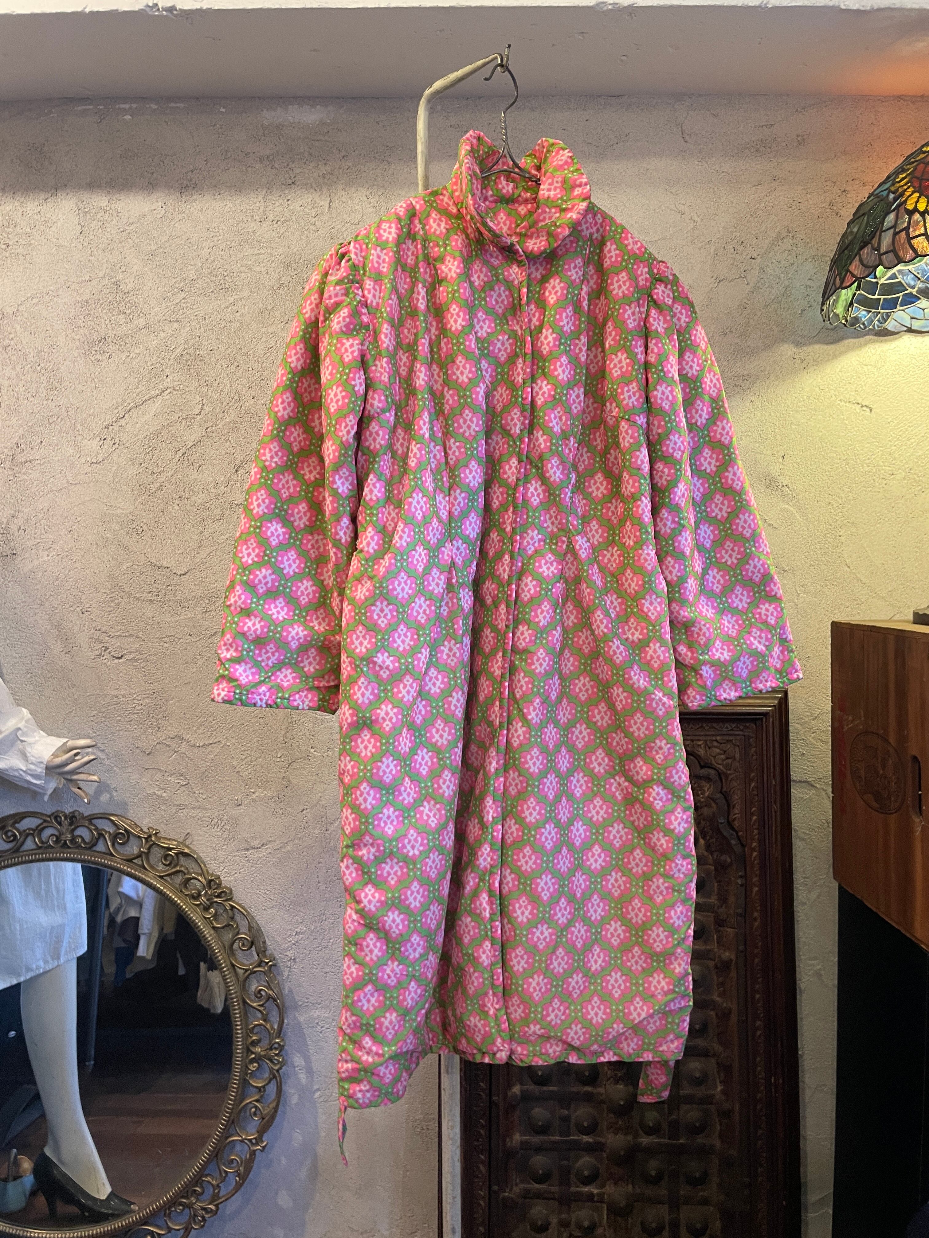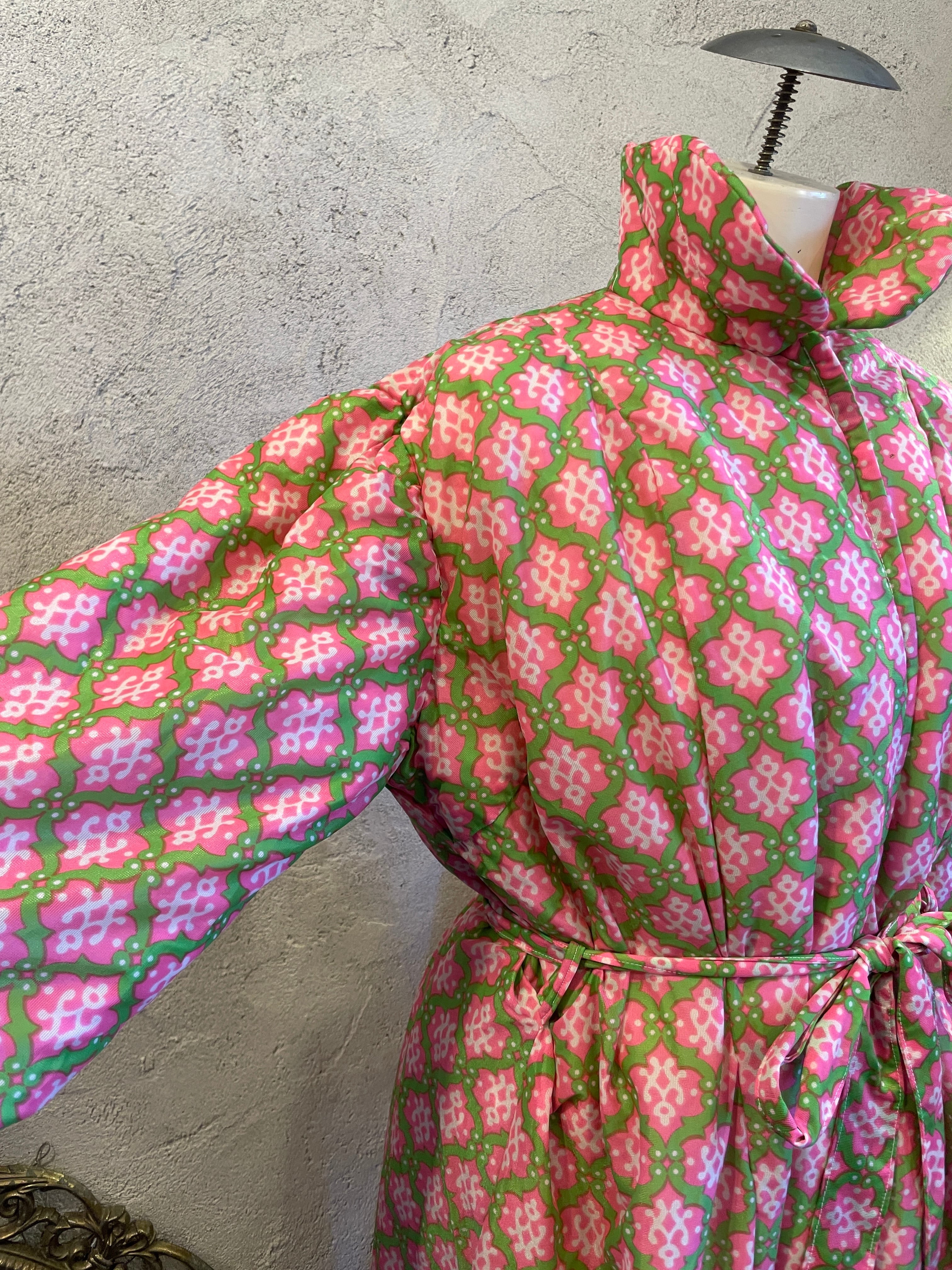 ピンク×グリーン 総柄 ガウン アウター 中綿 ヴィンテージ 古着
