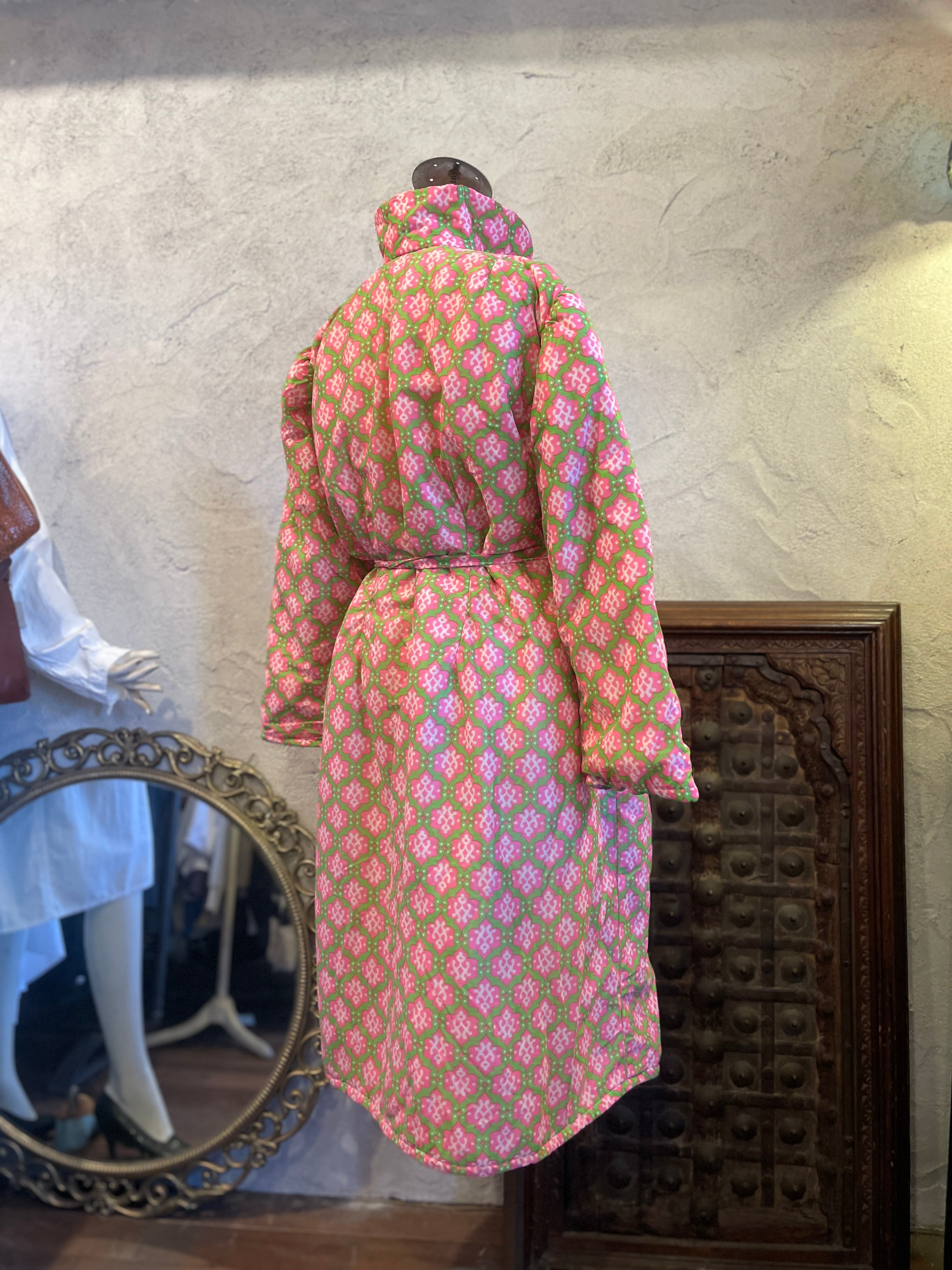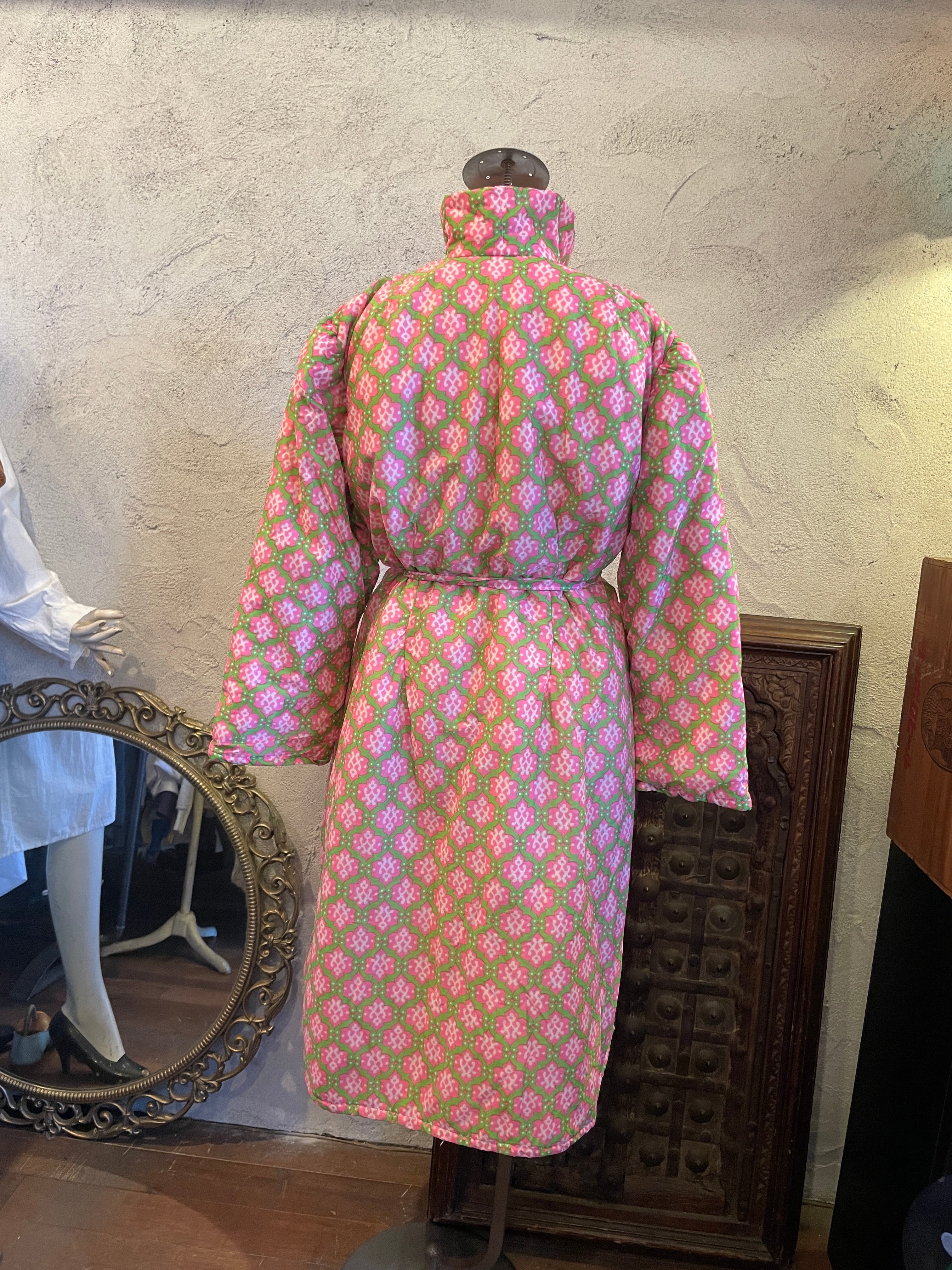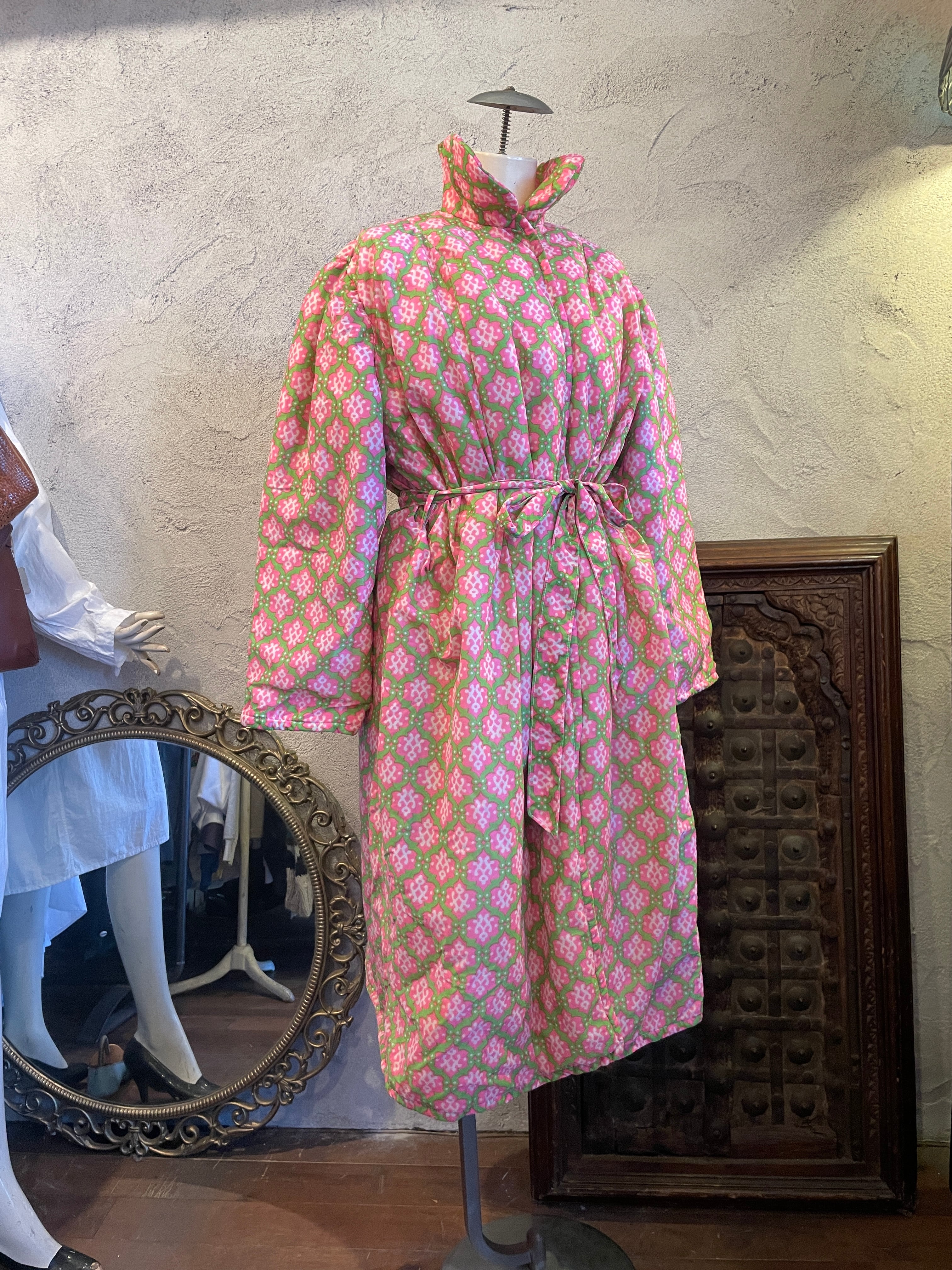 ピンク×グリーン 総柄 ガウン アウター 中綿 ヴィンテージ 古着