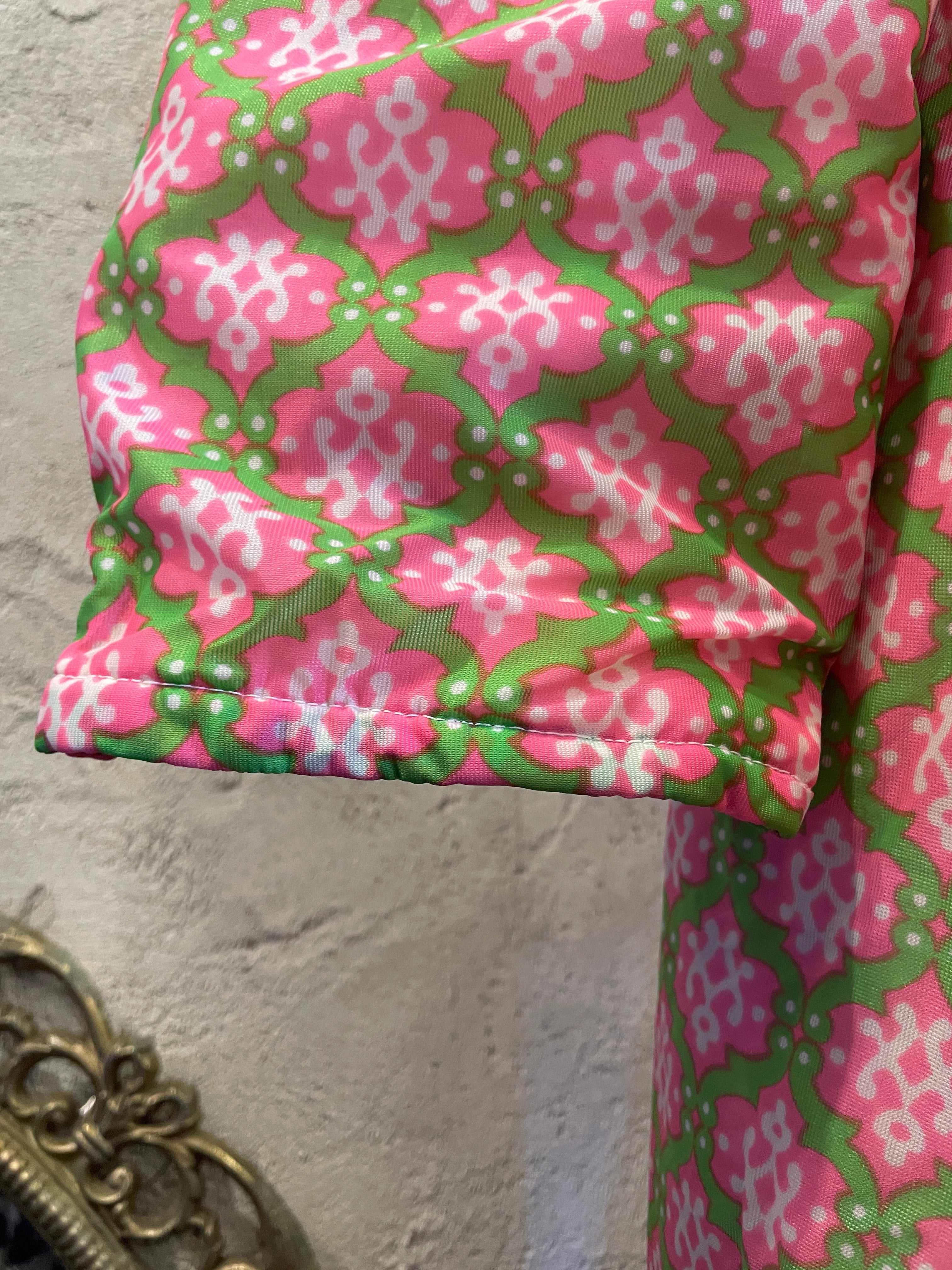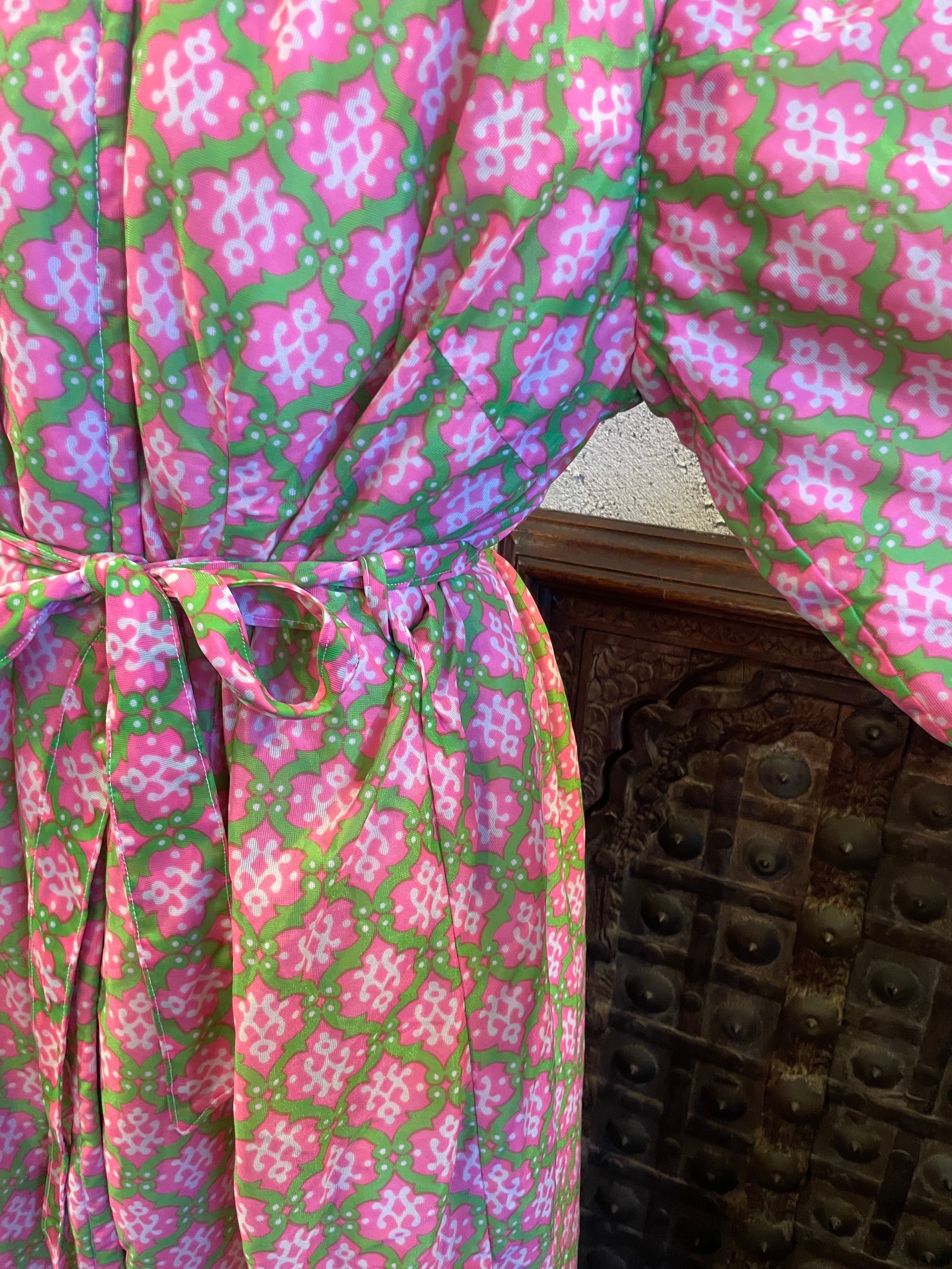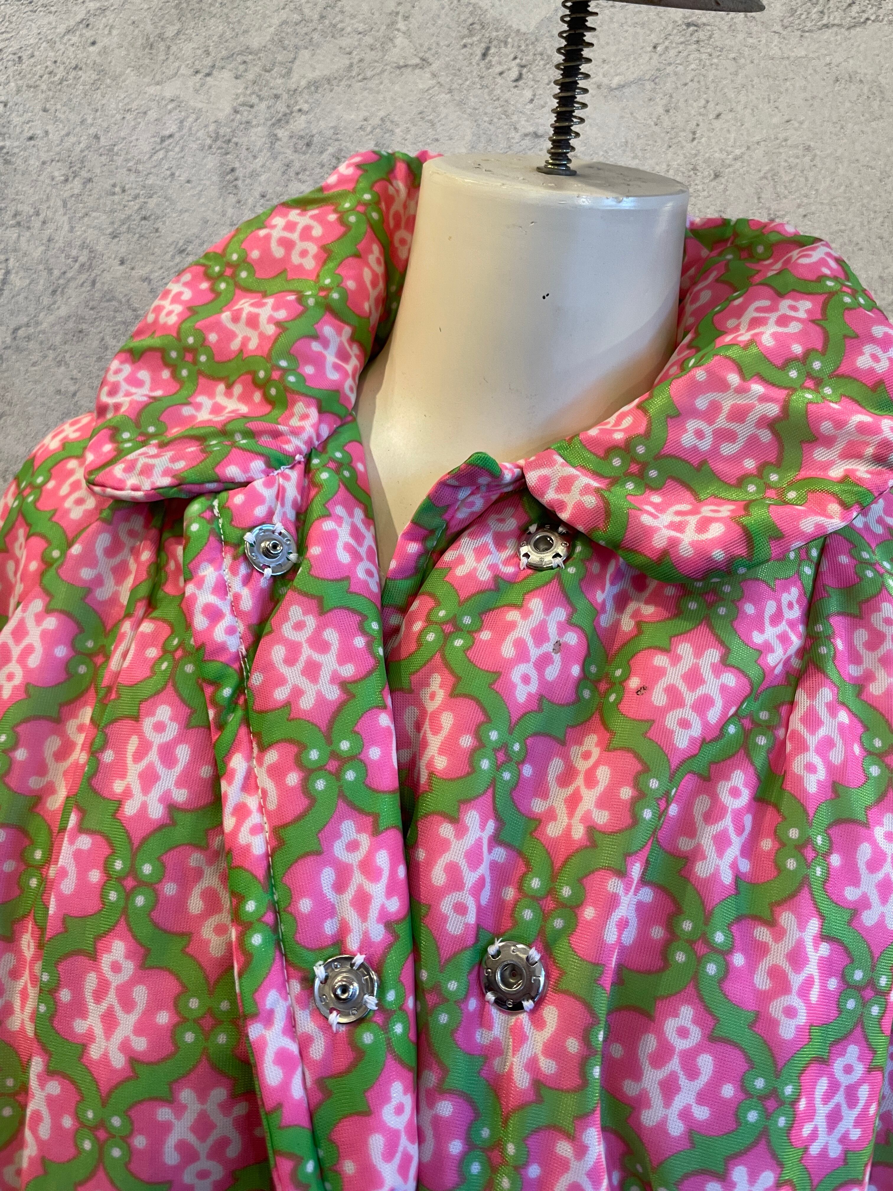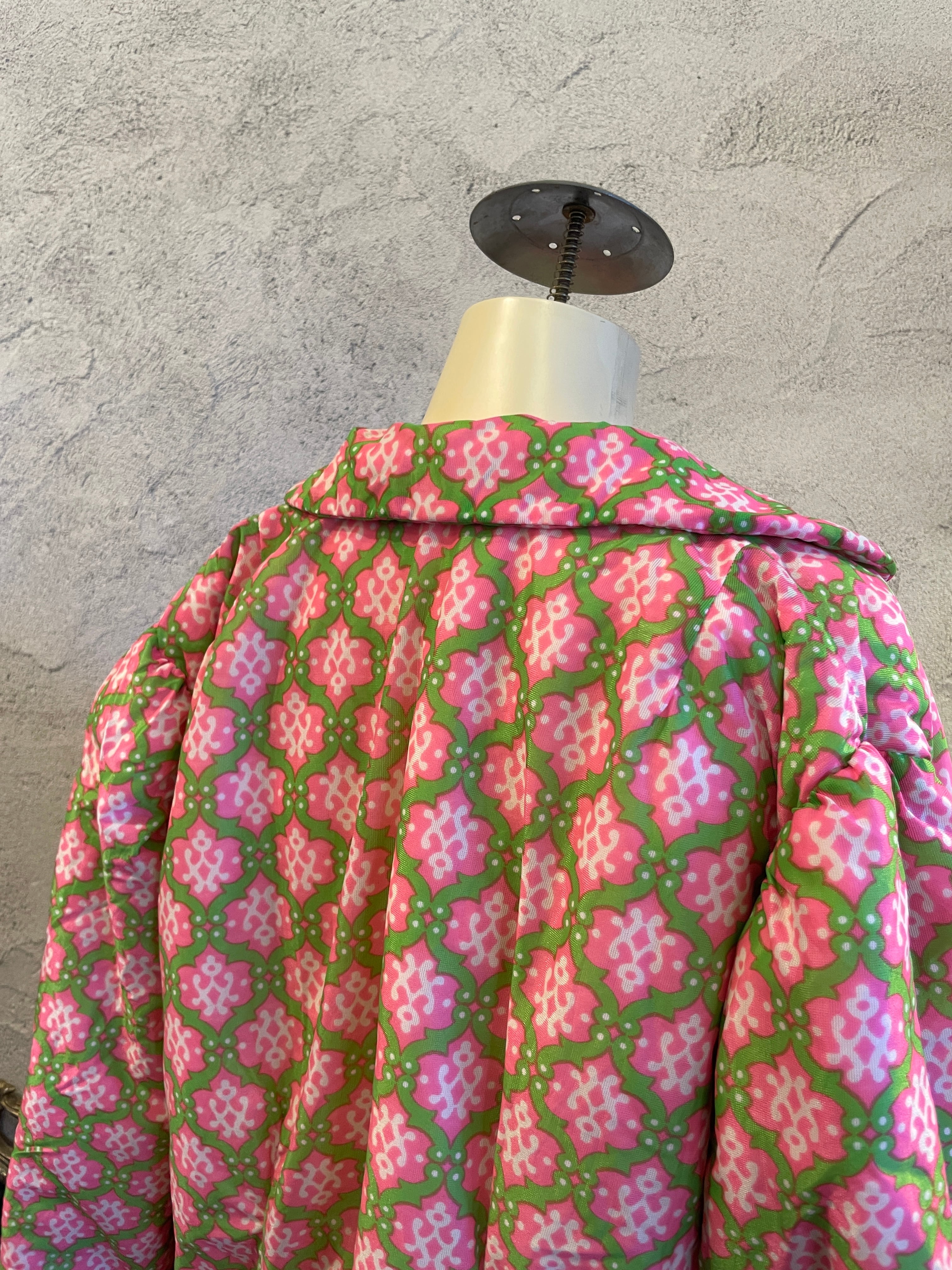 ピンク×グリーン 総柄 ガウン アウター 中綿 ヴィンテージ 古着