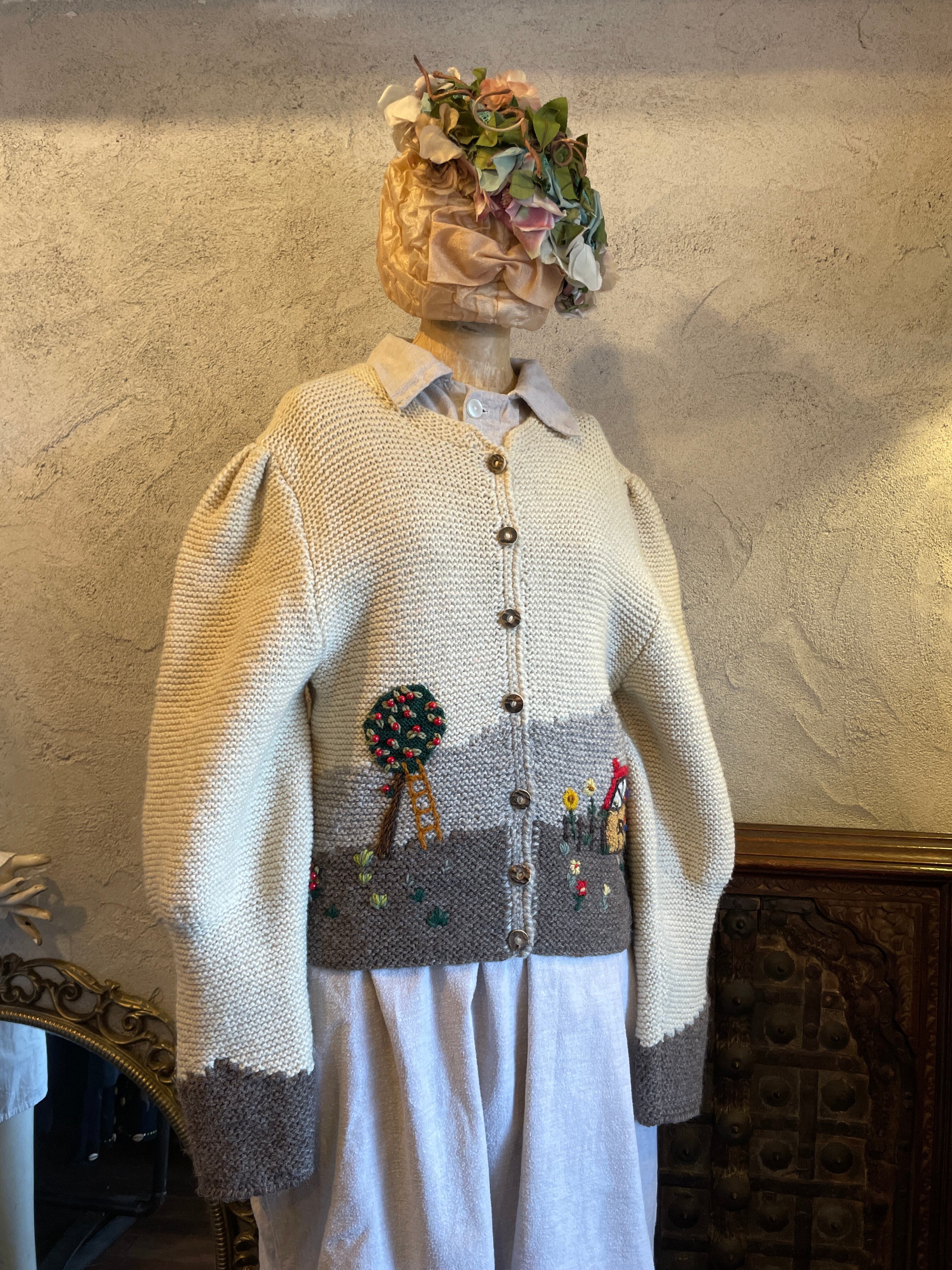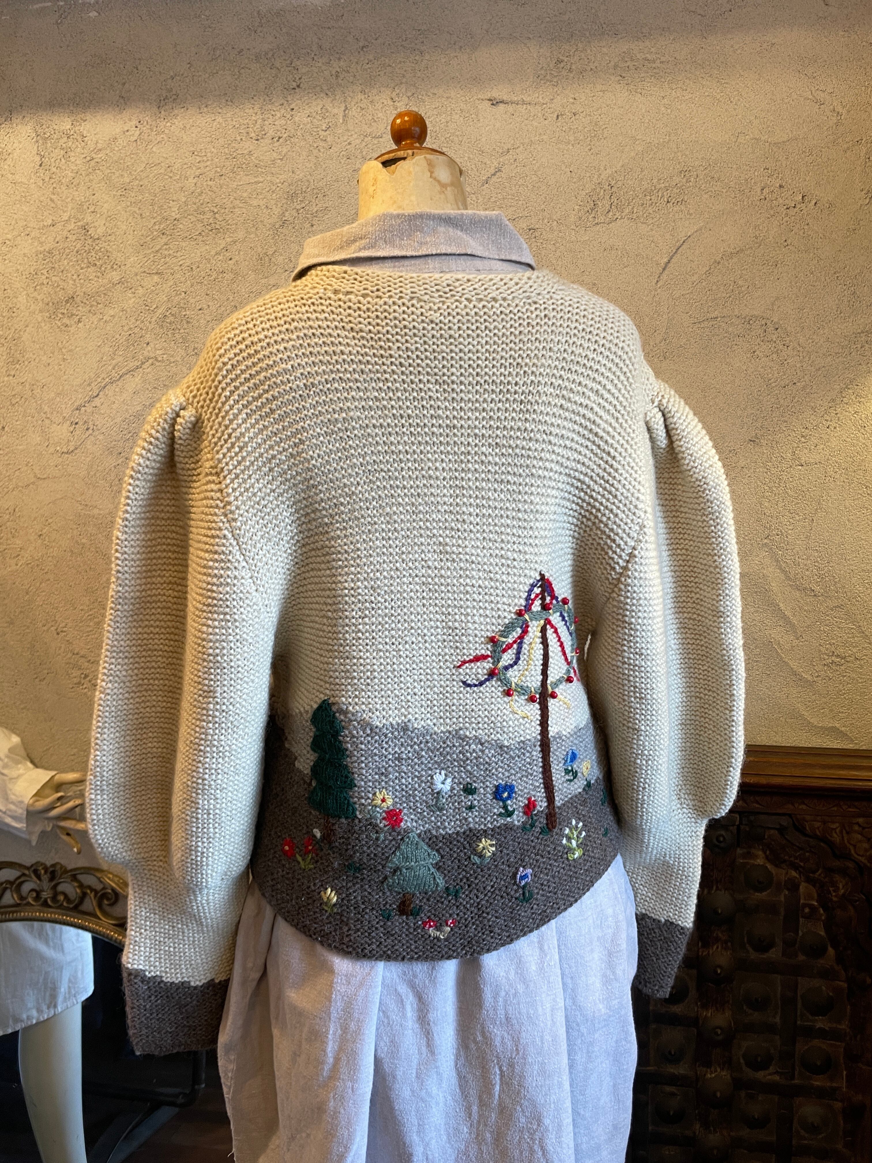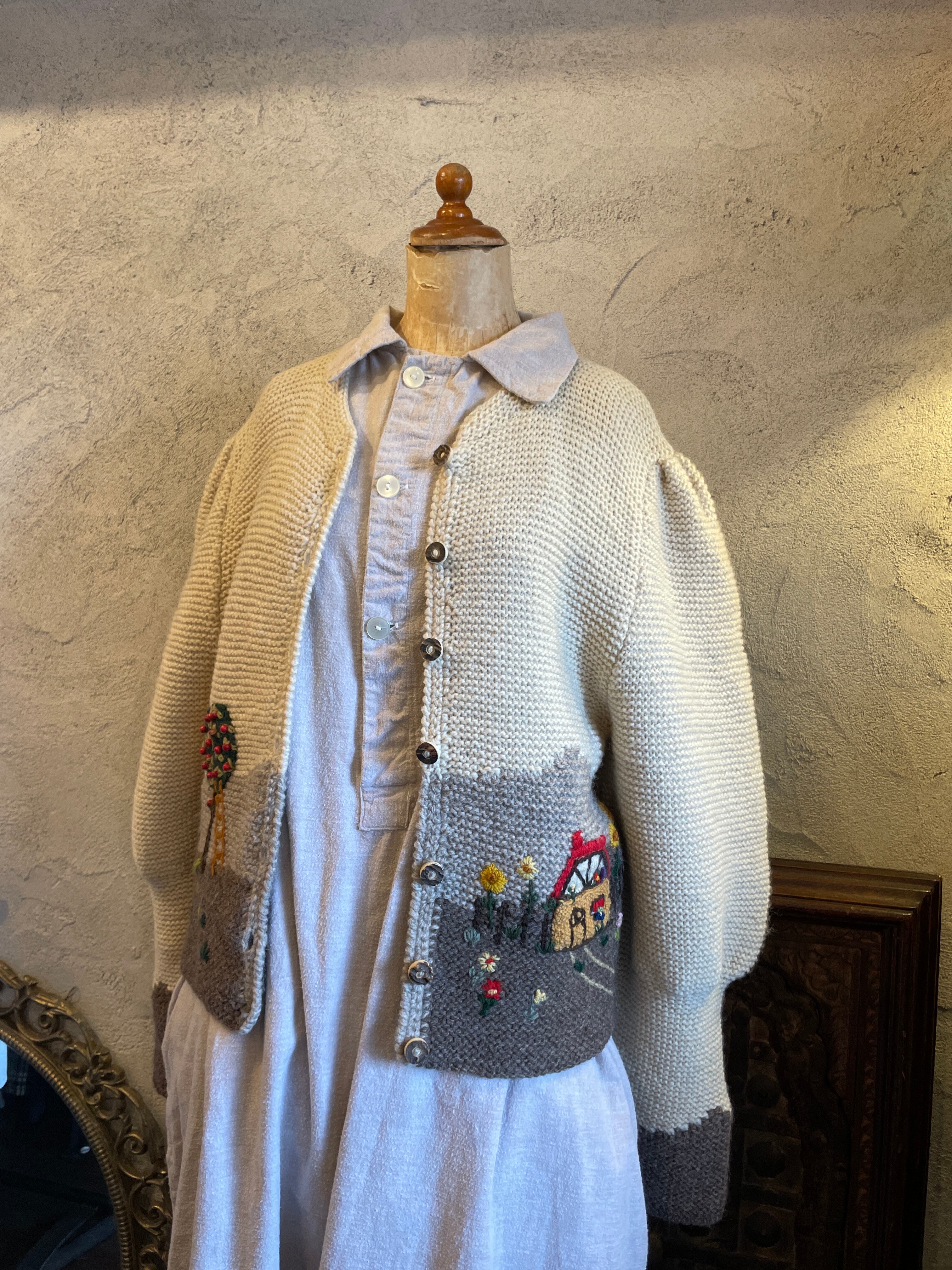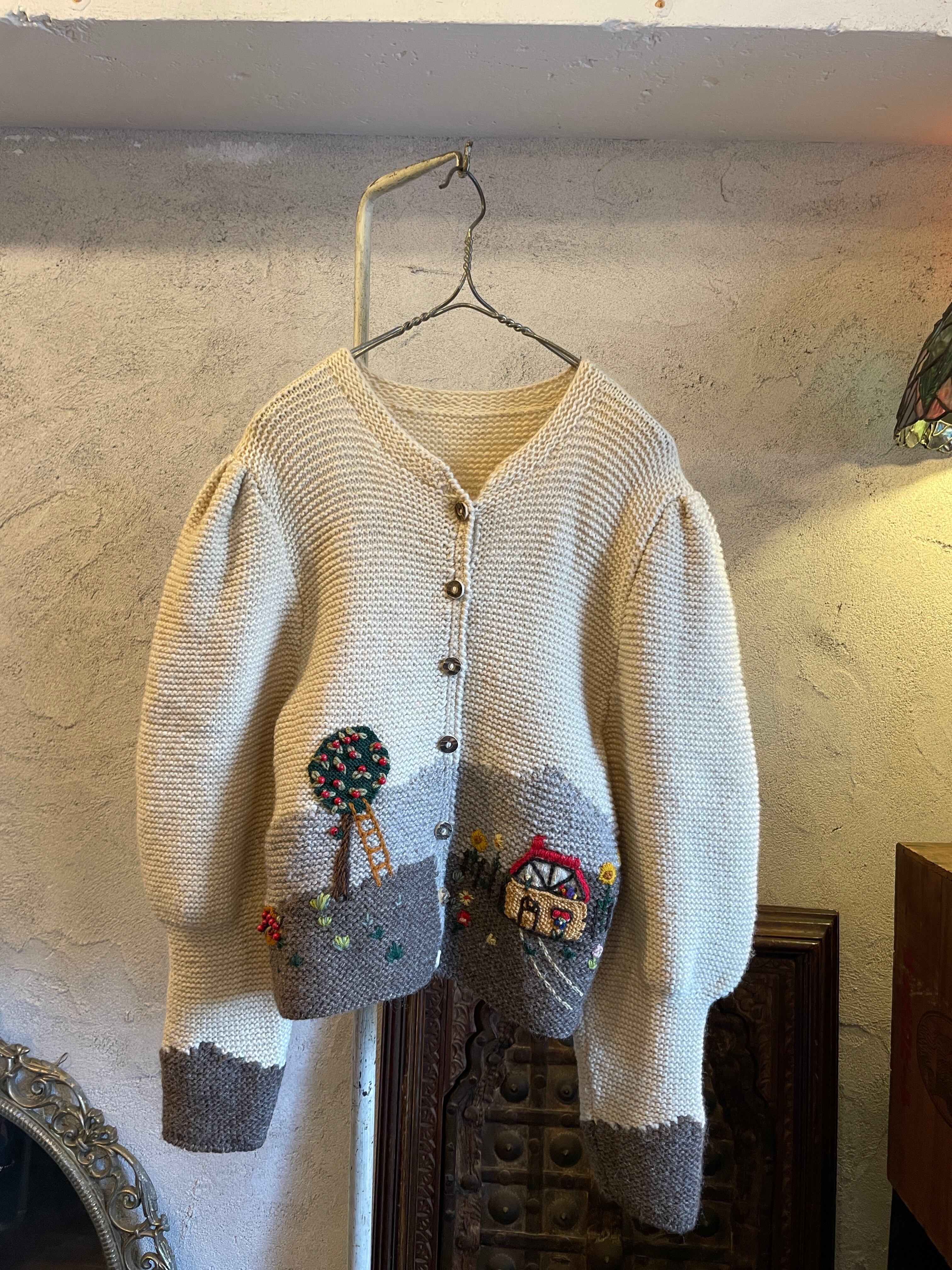 ハンドニット チロルカーディガン 風景柄 刺繍 ビーズ ヴィンテージ 古着