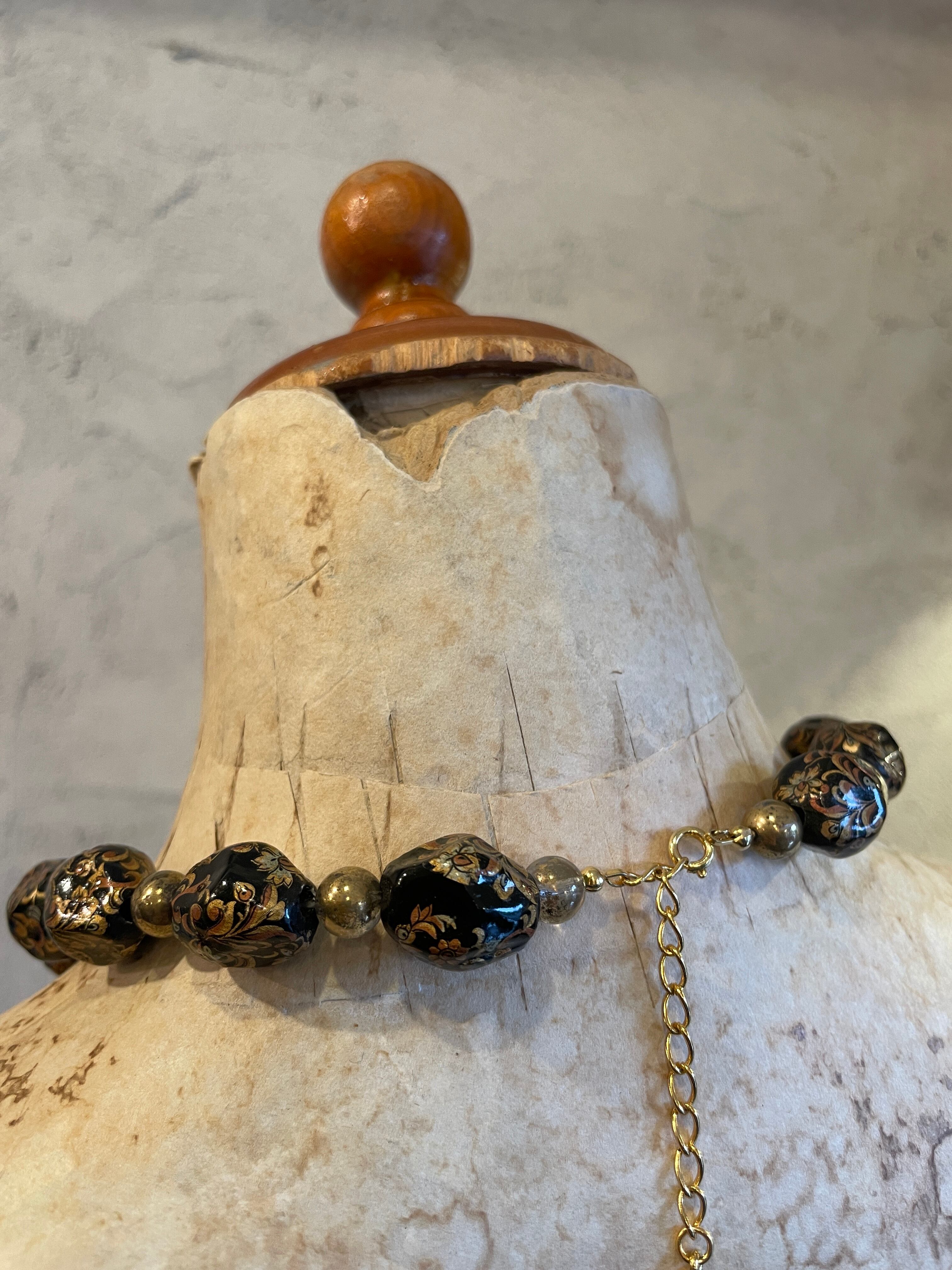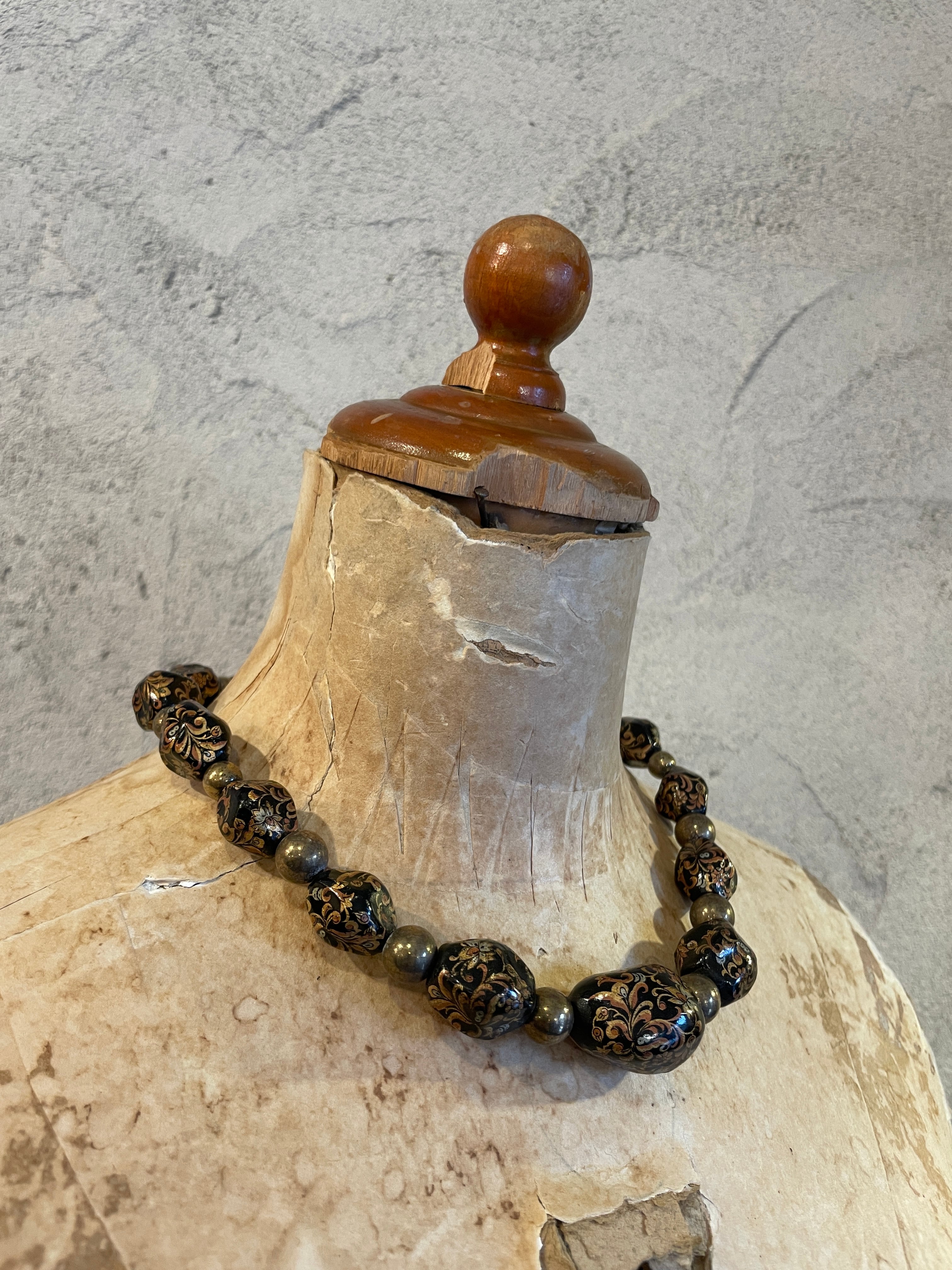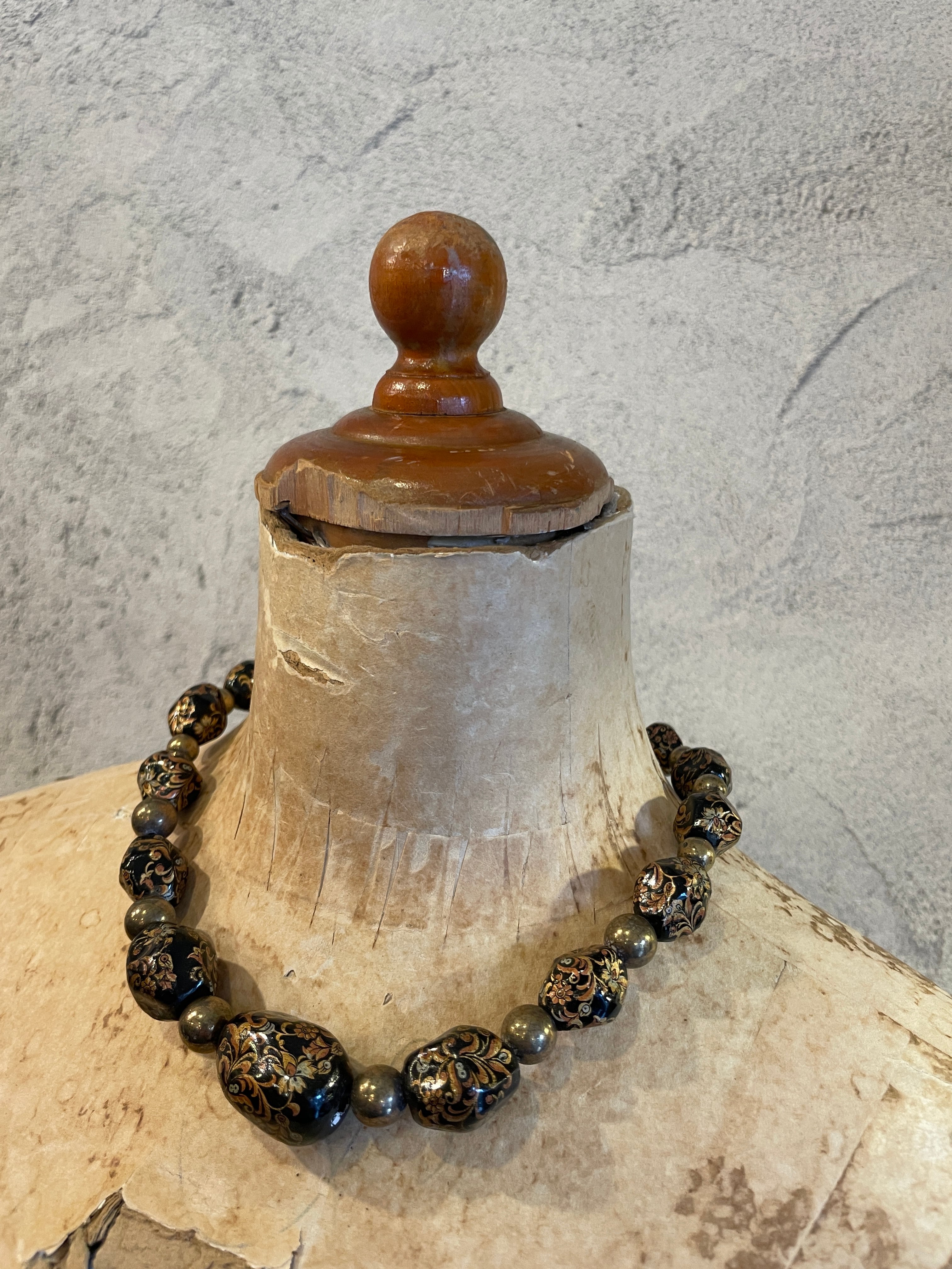 ブラックゴールドビーズ 植物柄蒔絵 ネックレス ヴィンテージ アクセサリー