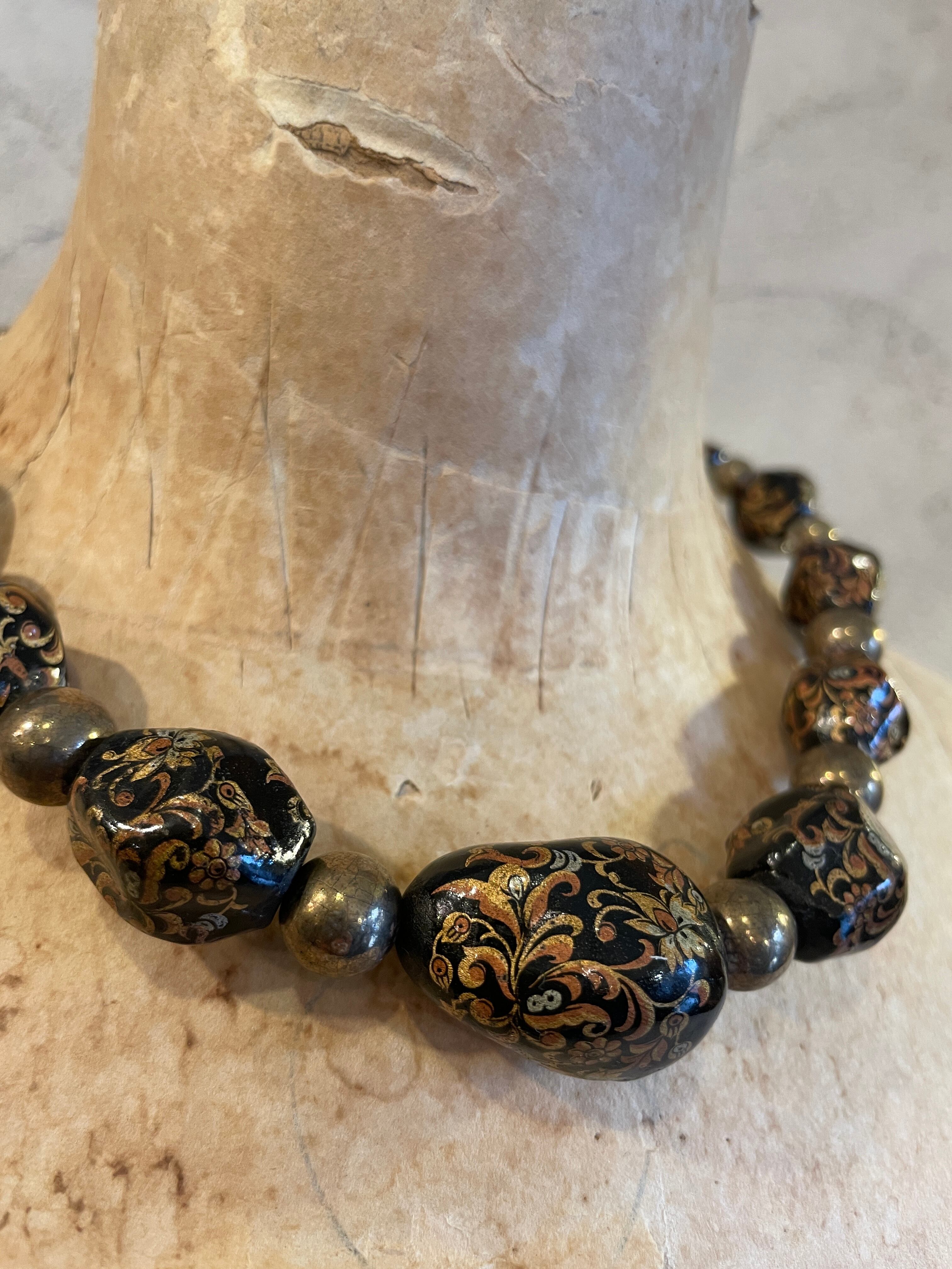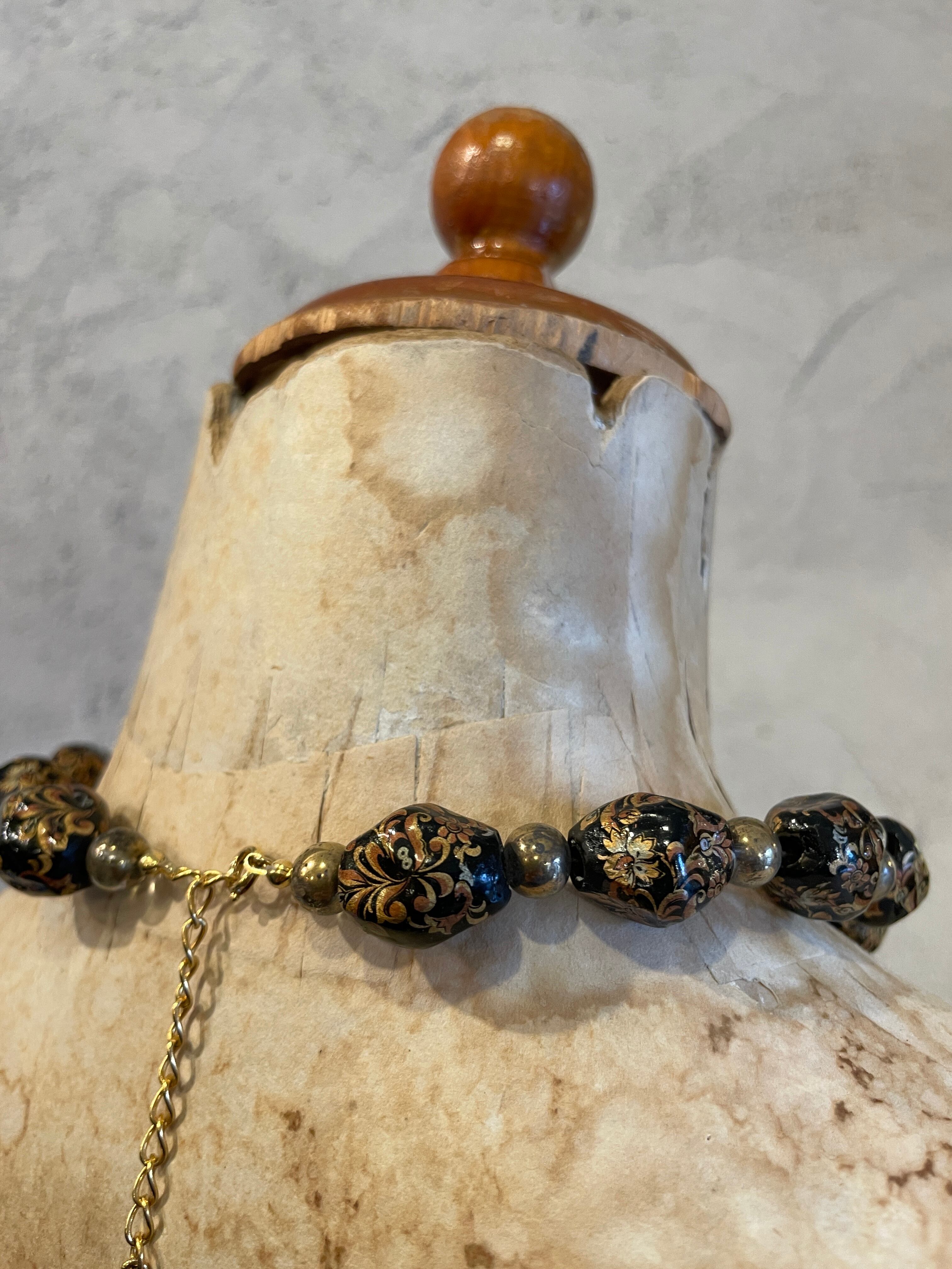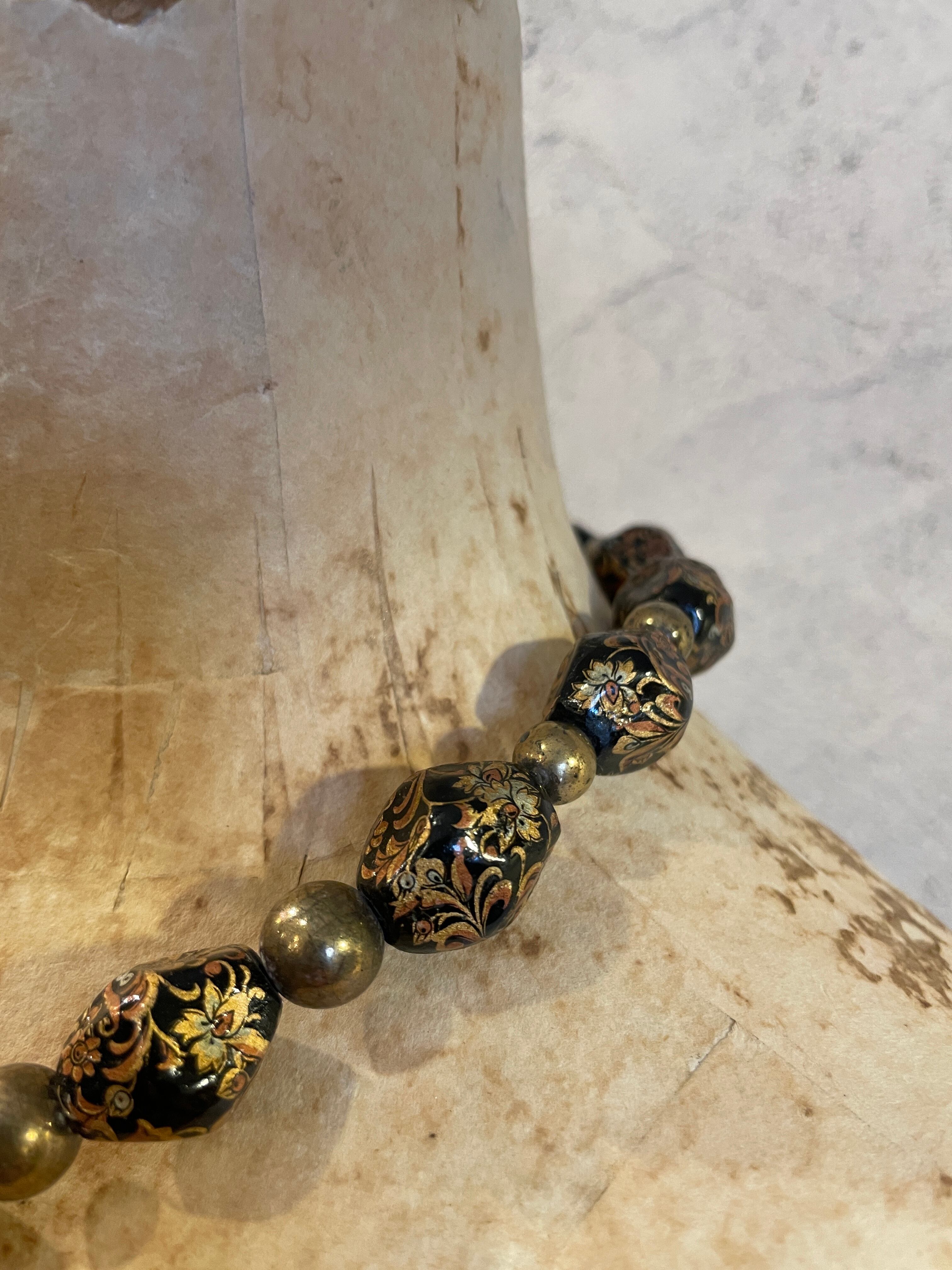 ブラックゴールドビーズ 植物柄蒔絵 ネックレス ヴィンテージ アクセサリー
