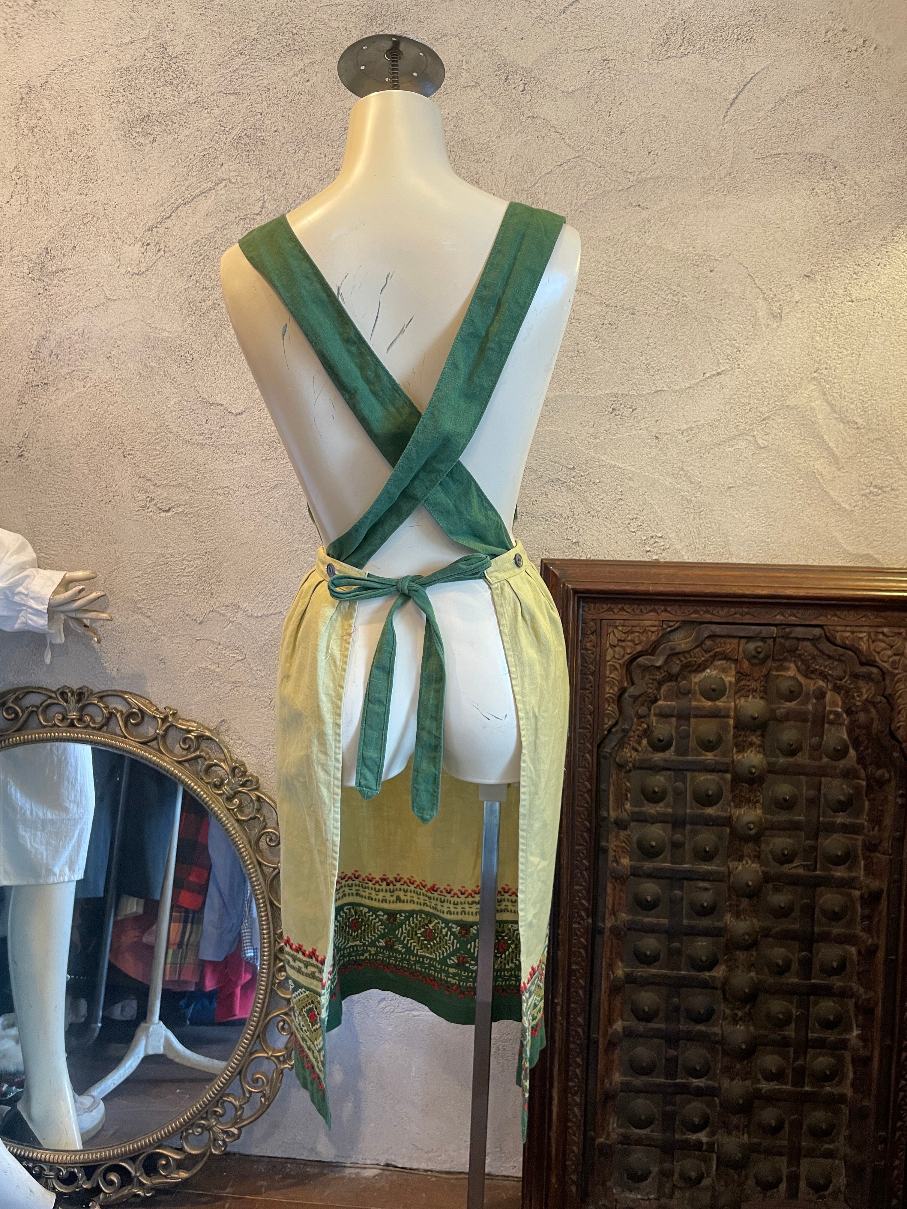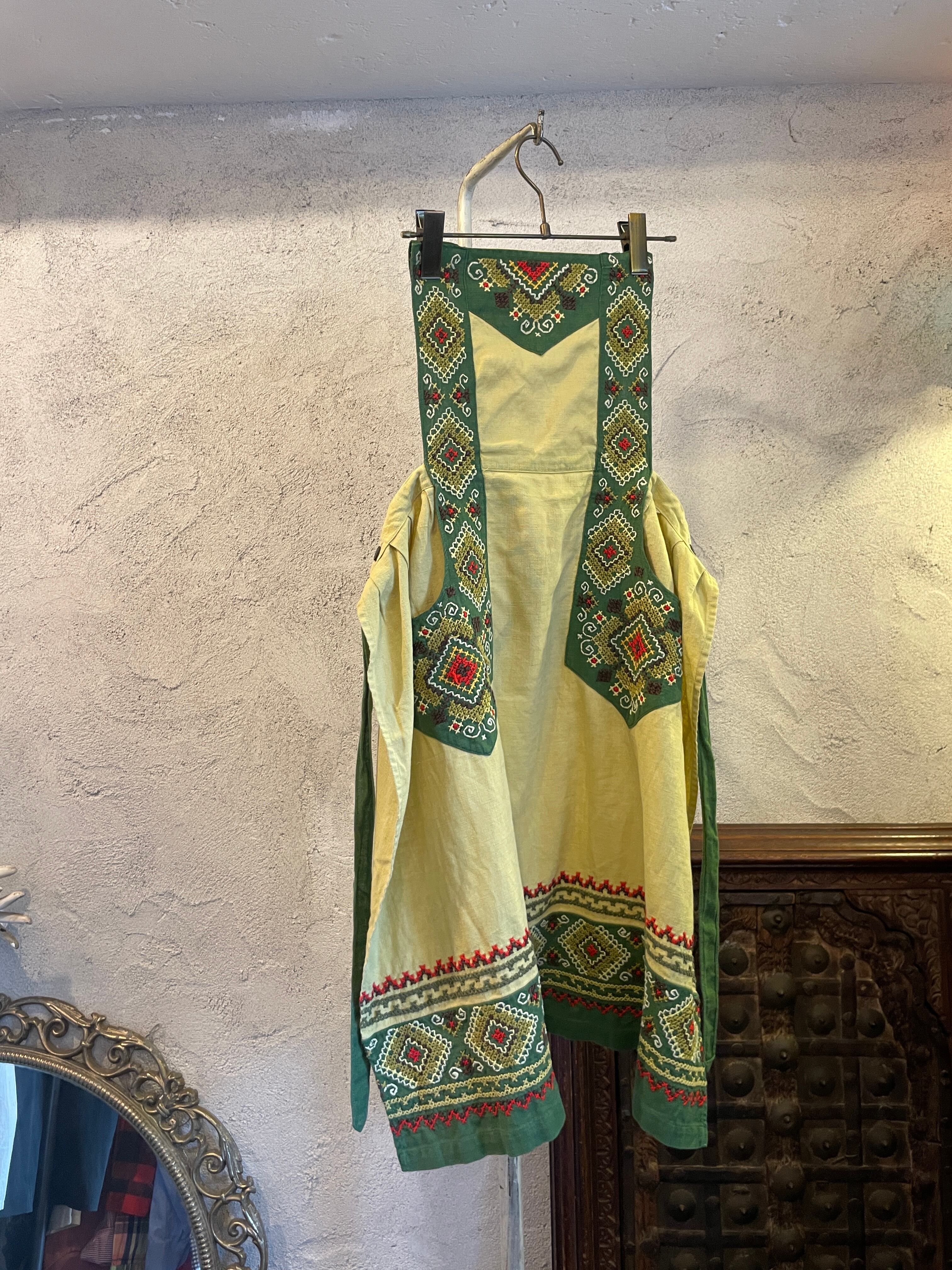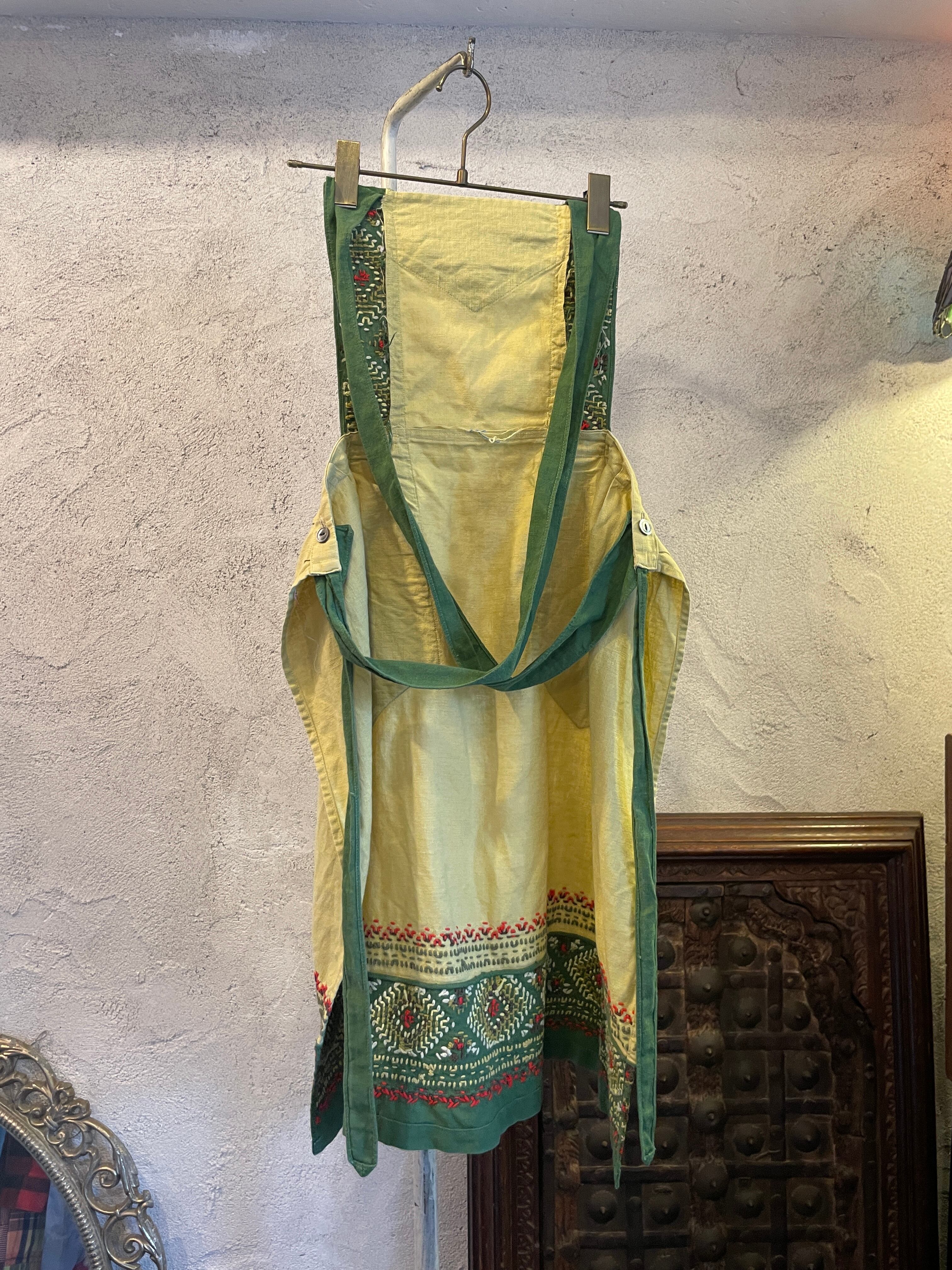 グリーン 刺繍 ステッチ エプロン ヴィンテージ 古着