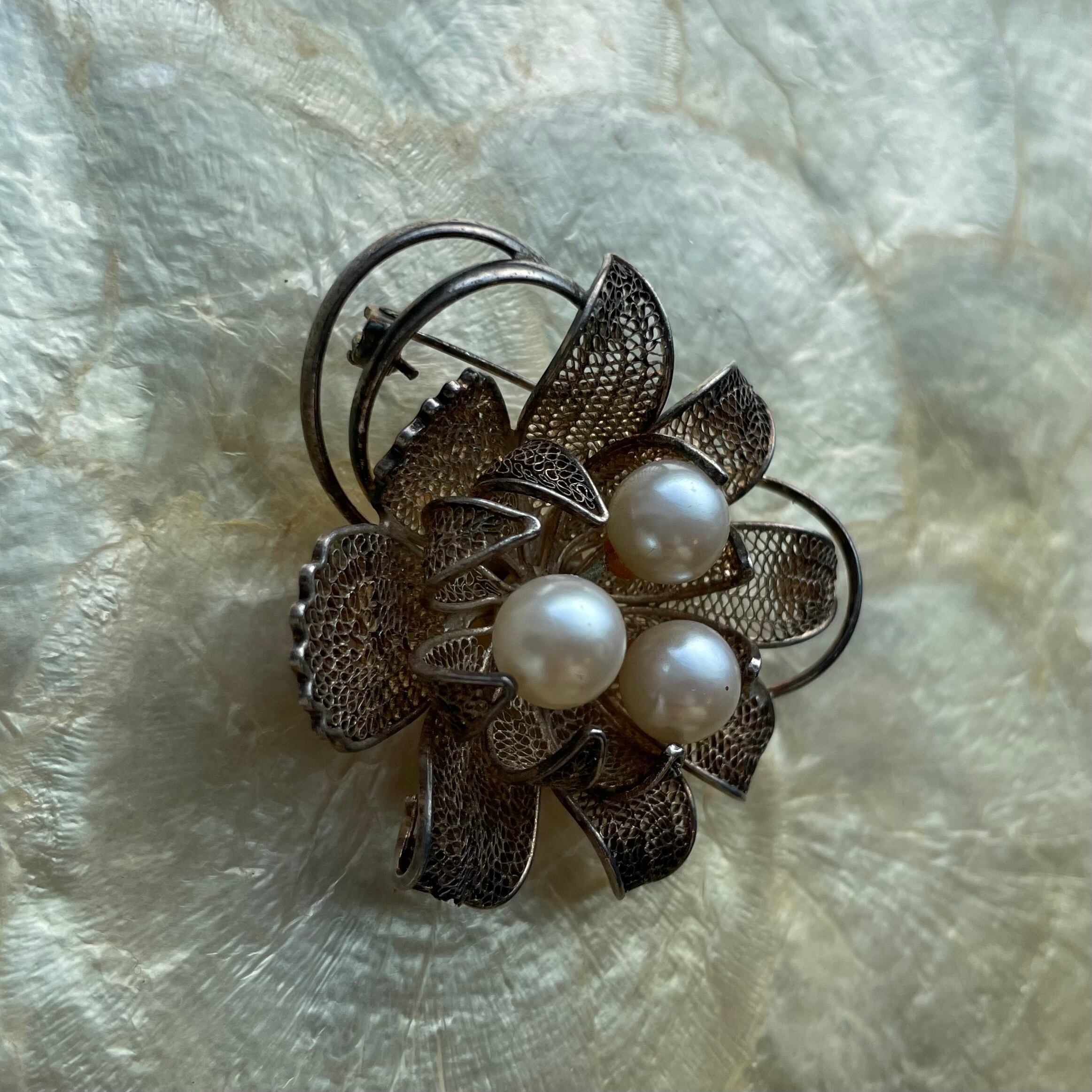 ブローチ シルバー パール フラワー ヴィンテージ アクセサリー
