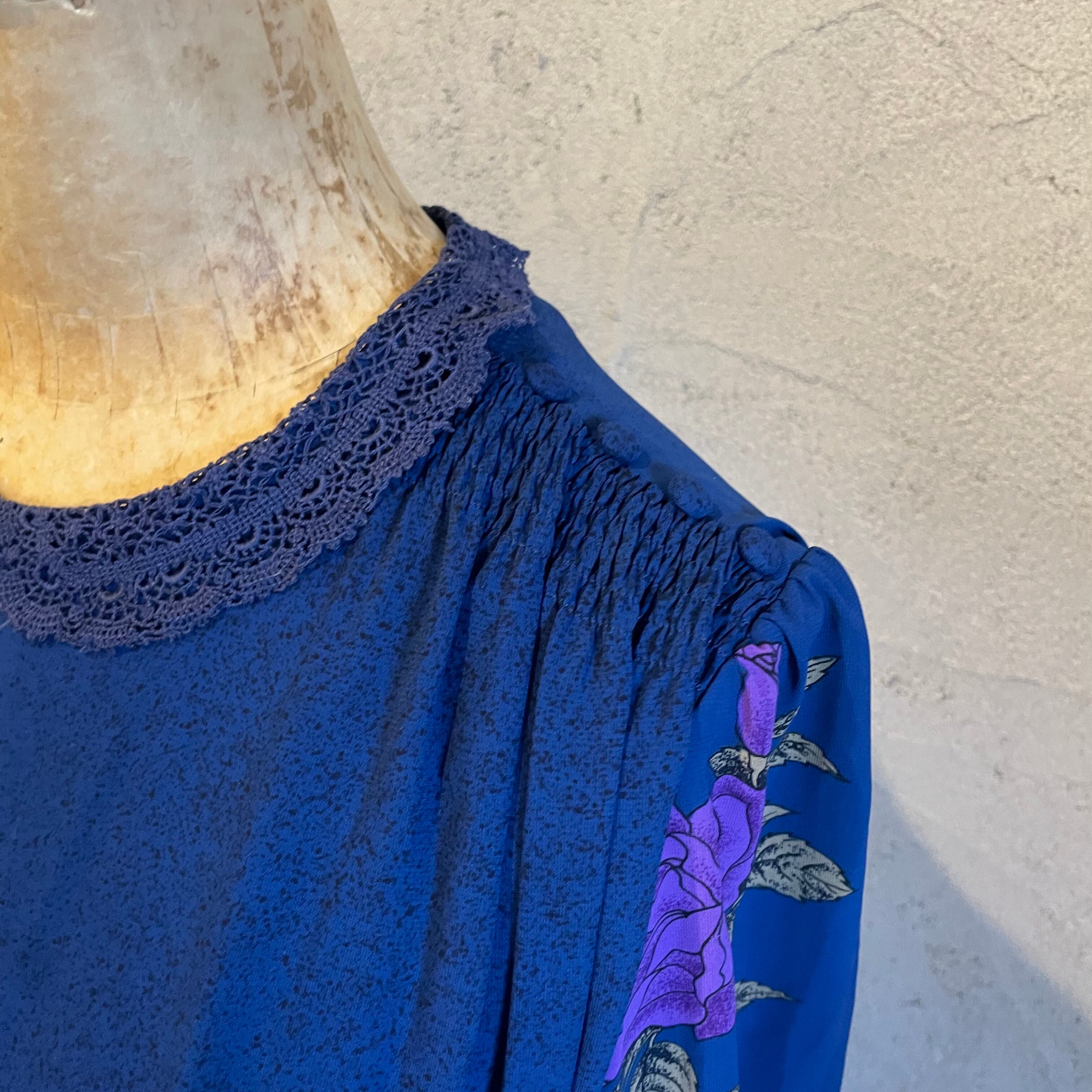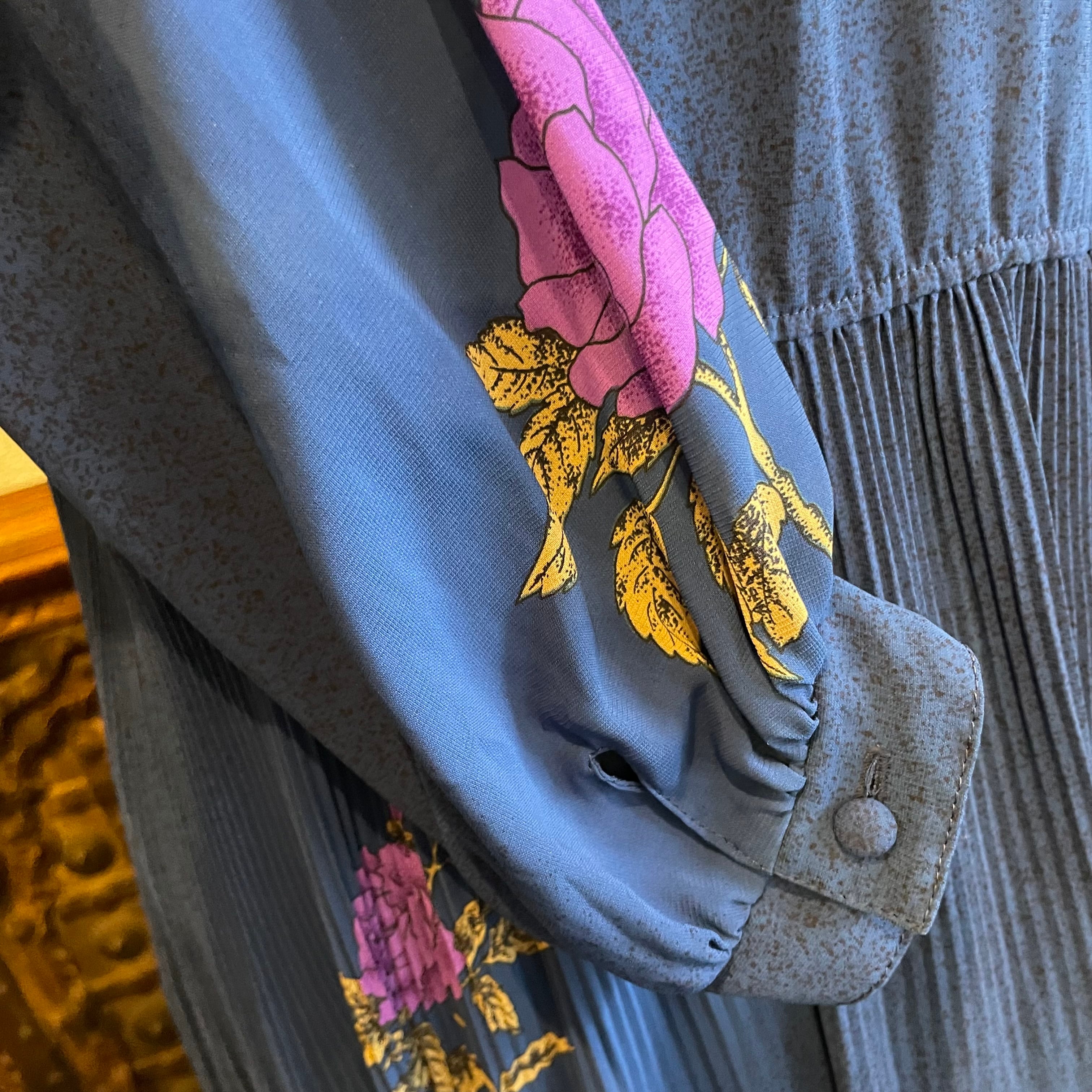 ブルーフラワーワンピース プリーツ レース襟 ヴィンテージ 古着